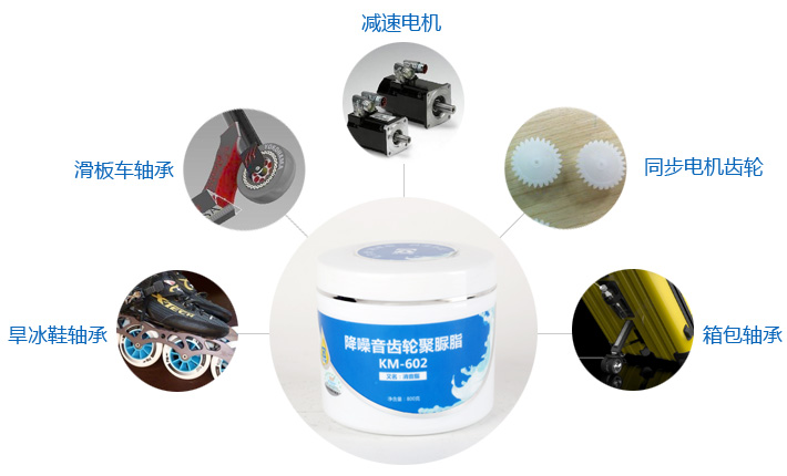 KM-602 降噪音齿轮聚脲脂是由精选复合油为基础油,脲基化合物为稠化剂并加有抗氧化、防锈蚀、抗腐蚀等多种添加剂精制而成,内含特制的高分子粘性润滑剂,专用于各种滑道、轴承、枢轴销、传动螺杆、齿轮等润滑、消音及防护。